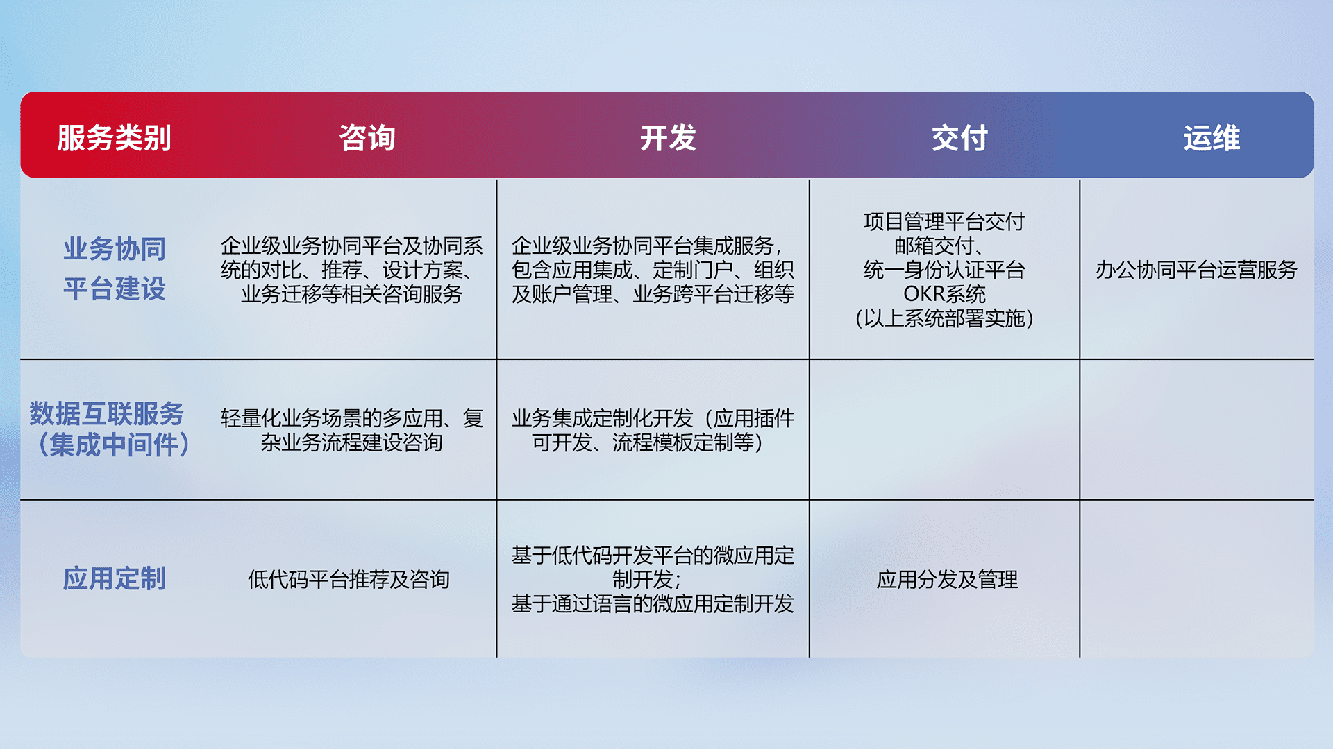 针对钉钉、、、企微、、、IDaas等平台级产品提供产品的规划、、、方案、、、、交付、、定制化开发等服务,,实现如统一协同办公、、、智能客户服务、、、、混合会议管理、、、、智能数据查询、、、等业务场景,,,,实现数字化转型。。。